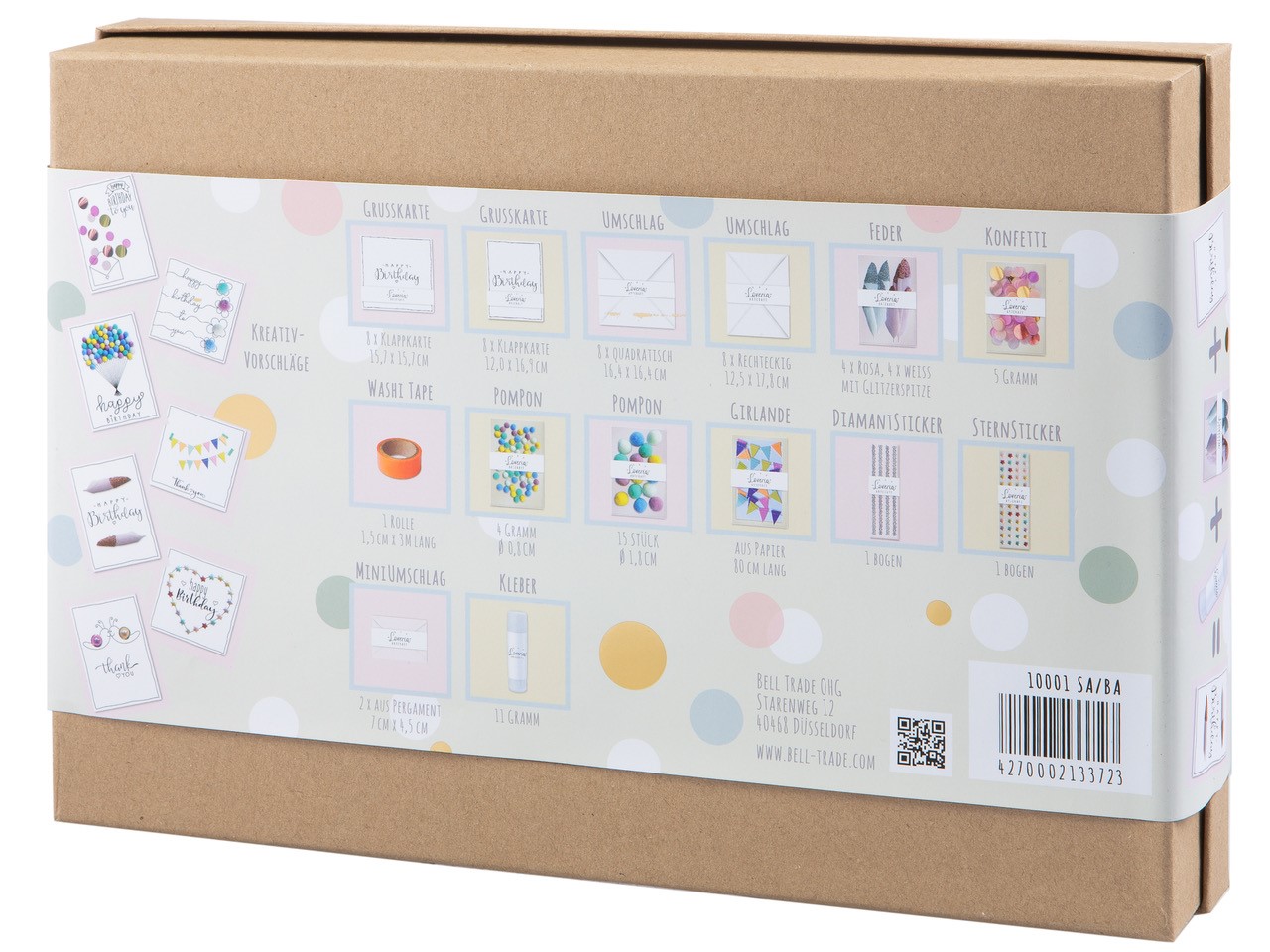 Dieses Set mit 100 Geschenkanhängern ist ein perfektes Geschenk für alle kleinen Bastler und Handwerker. Diese selbst gestalteten Geschenkanhänger sind ideal für individuelle Geschenke. Mit diesem Set können Sie Ihre Präsente noch schöner gestalten und Ihren Liebsten eine Freude machen.Karton Größe: 23 x 16 x 3 cmDAS SET ENTHÄLT: 25 rechteckigen Geschenkanhänger Kraftkarton25 rechteckigen Geschenkanhänger weißes Karton25 runden Geschenkanhänger weißer Karton25 herzförmige Geschenkanhänger Kraftkarton Stempelset mit 5 Holzstempeln und 2 Farben 2x10m Zweifarbig Kordel auf Holzspule