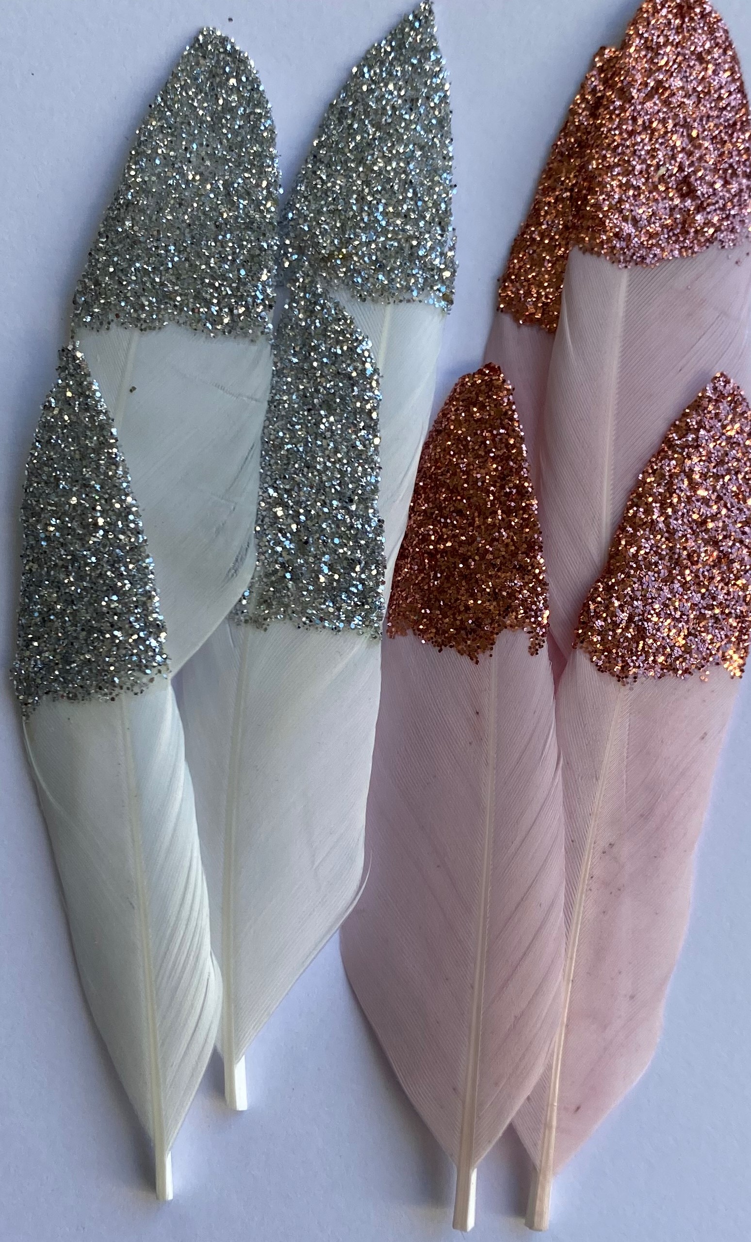 - 4 rosa Federn mit Glitterspitze, 4 weiße Federn mit Glitterspitze