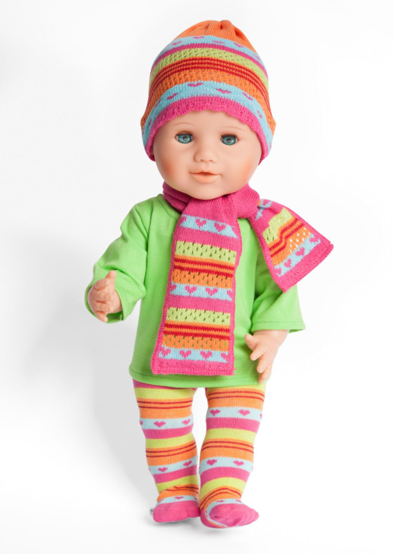 Das Mützen- und Schalset "Hearty" ist ein trendiger Begleiter für alle kühleren Jahreszeiten. Der bunte Strickmix lässt sich perfekt mit dem Puppenstrickkleid "Hearty" kombinieren. Er ist auch eine peppige Ergänzung zu anderen Outfits. Das Set passt für die meisten handelsüblichen Puppen der Größe 28-35 cm. Es ist auch in einer weiteren Version für die Puppengröße 35-45 cm erhältlich. Material: Mütze und Schal: 100% Polyacryl